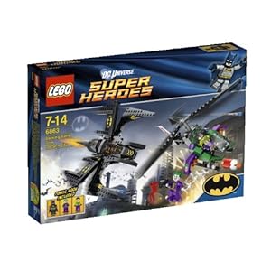 Foil the Joker's dastardly plans with the Lego Superheroes Batwing Battle Set . The Joker is going to gas the citizens of Gotham from his helicopter! Swoop into action with the Batwing and take him down with your flick firing missiles. This set includes; Batman, Joker and Henchman minifigures Batwing vehicle with flick firing missiles Joker's helicopter with spinning rotors, uncoiling ladder and gas bomb